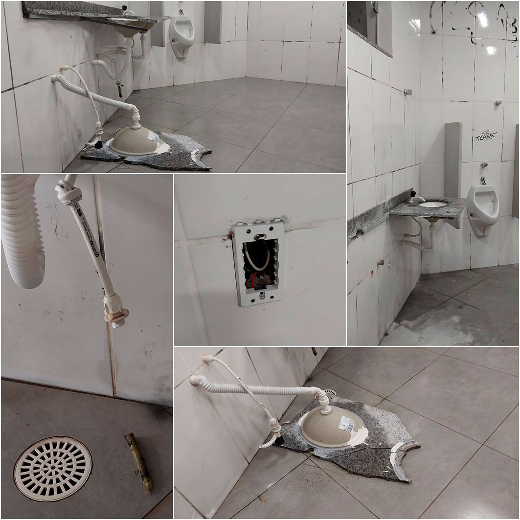 É inevitável dizer que o Lago Artificial Ophelia Borges Silva Alves está lindo, com as decorações e enfeites do Natal Encantado, recebendo todos os dias um grande público que visita o local e as atrações. Mas, se ao redor do Lago as decorações deixam o local belo, infelizmente não podemos dizer o mesmo para os banheiros. Novamente vândalos depredaram e danificaram parte das instalações, e dessa vez em pleno Natal Encantado. Estivemos no local para fotografar e verificamos que além da pichação, parte da pia do banheiro estava quebrada no chão. Mais da metade da pedra de granito foi destruída, danificando a instalação hidráulica também.