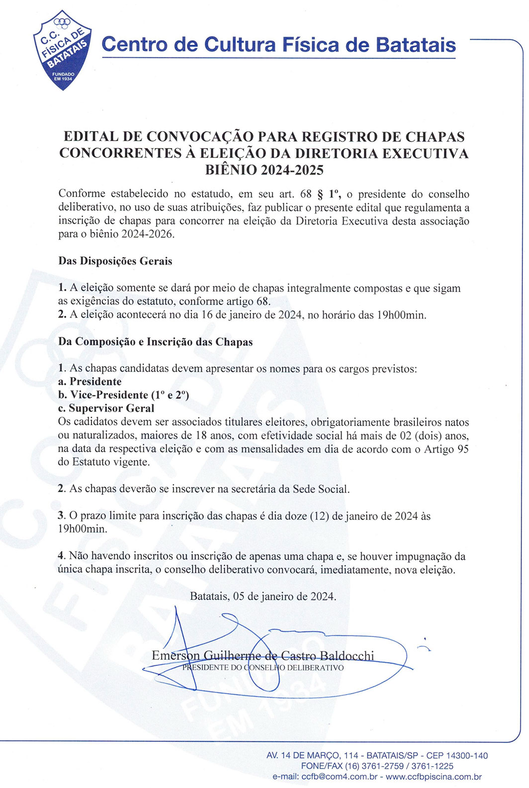 Destaques5 de janeiro de 2024 Centro de Cultura Física – Edital de Convocação Related posts Batatais encerra consulta sobre concessão…3 de abril de 2026A espera acabou: áreas da…3 de abril de 2026Câmara de Batatais avança na…3 de abril de 2026Incubadora de Empresas de Batatais…3 de abril de 2026