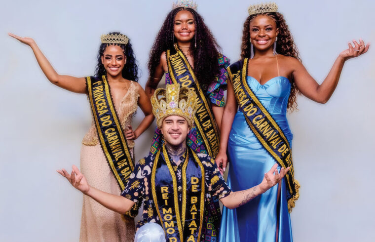 O Carnaval de Batatais será representado pela Corte 2026, formada pela Rainha Maria Luiza Almeida Marcelo, pelo Rei Momo Jeferson José da Silva e pelas Princesas Tauana Caroline Cipriano e Janaína Elisabete dos Santos.
