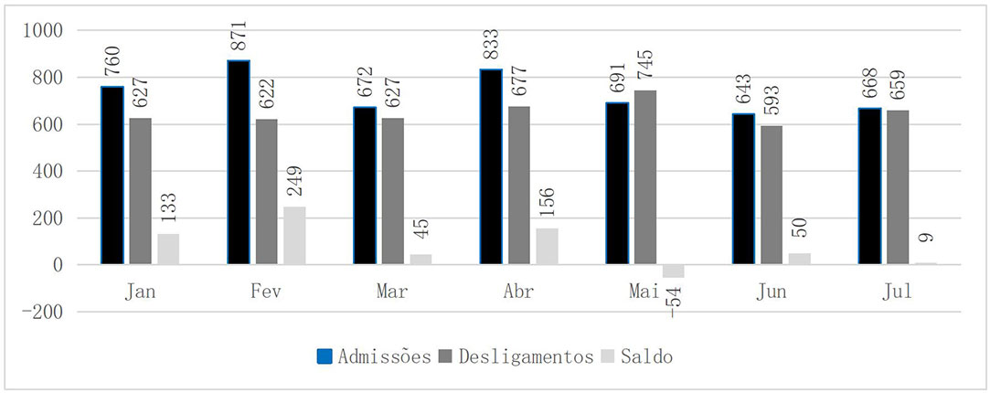 O melhores saldo no ano de 2025 foi no mês de fevereiro com um saldo de 249 empregos, no mês de abril 156, em janeiro 133, em junho 50, em março 45 e julho 9. O mês de maio teve um saldo negativo de 54 empregos.