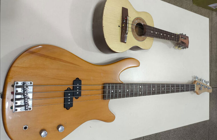 Durante patrulhamento pela Rua Santos Dumont, uma equipe da PM avistou o suspeito empurrando um carrinho de compras pela Rua dos Andradas. Ao ser abordado, os policiais encontraram dentro do carrinho um ukulele e um contrabaixo, ambos da marca Gianini.