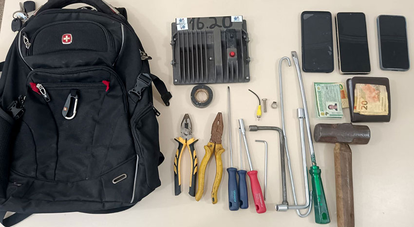 Com os três homens, identificados pelas iniciais H.A.C.S.S., W.A.C.S.S. e R.S.S., os policiais encontraram um módulo eletrônico, uma mochila e 13 ferramentas, todas comumente utilizadas em práticas de furto de veículos.