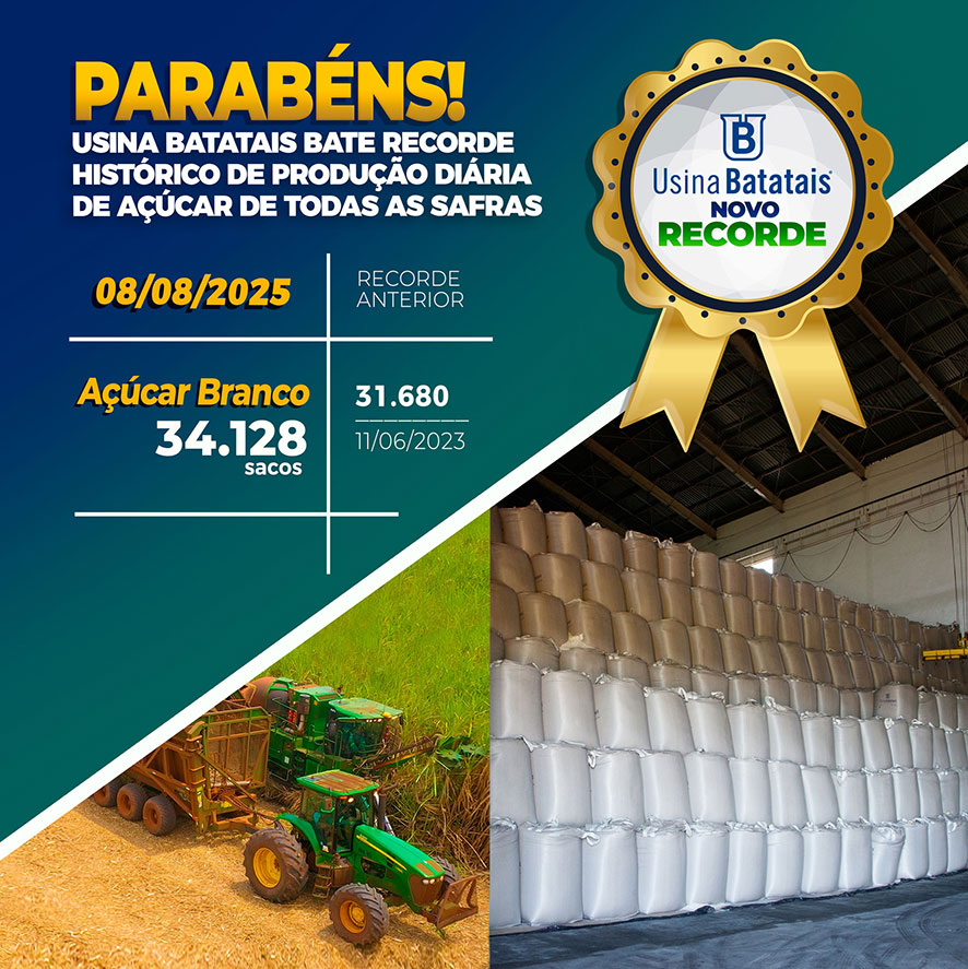 A Usina Batatais alcançou, no último dia 8 de agosto de 2025, um marco histórico: a maior produção diária de açúcar branco de todas as suas safras, totalizando 34.128 sacos em apenas um dia. O recorde anterior, de 31.680 sacos, havia sido registrado em 11 de junho de 2023.
